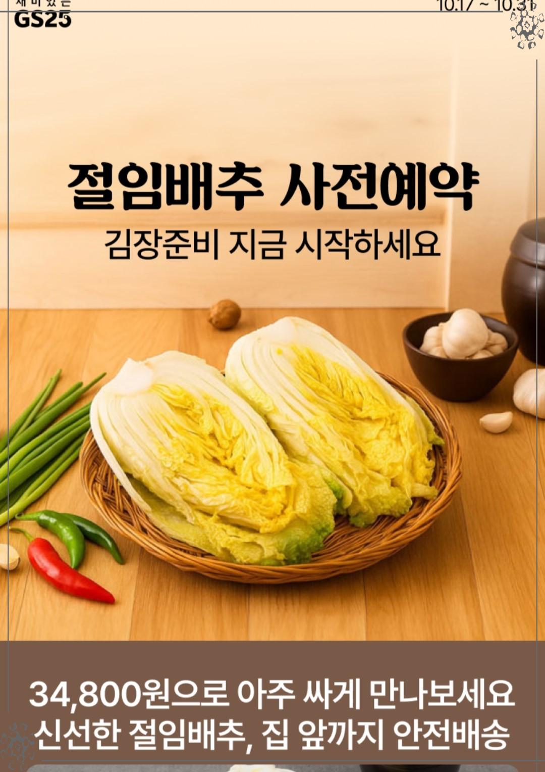 김장은 우리 식탁에 일 년 내내 오를 김치를 준비하는 중요한 행사인 만큼, 이번 GS25의 절임배추 사전예약 행사가 많은 분들에게 도움이 됐으면 좋겠네요. 우리 동네 GS 앱을 통해 10월 31일까지 신청할 수 있으니 관심 있으신 분들은 서두르세요! 겨울을 맞이할 준비, 지금부터 차근차근 시작해 볼까요?